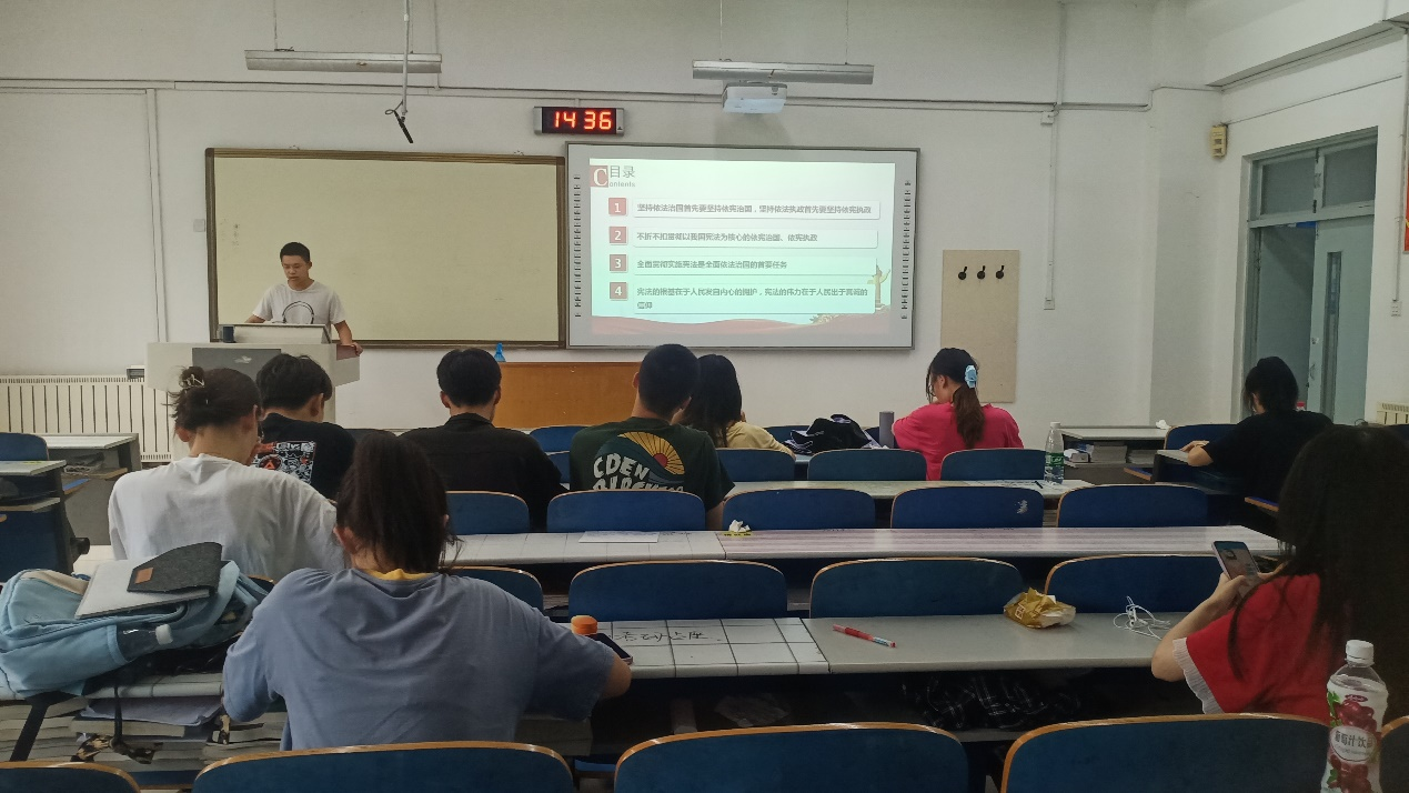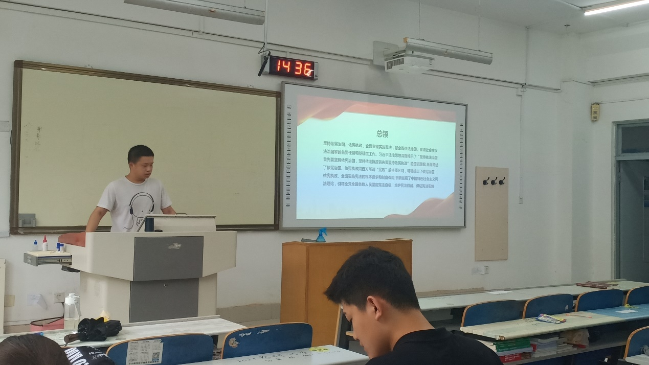 支部党员郭永翔同志发表了感言:“要始终坚持宪法法律至上,维护国家法制统一、尊严、 权威,一切法律法规规章规范性文件都不得同宪法相抵触,要以自身行动贯彻落实好习近平法治思想。”