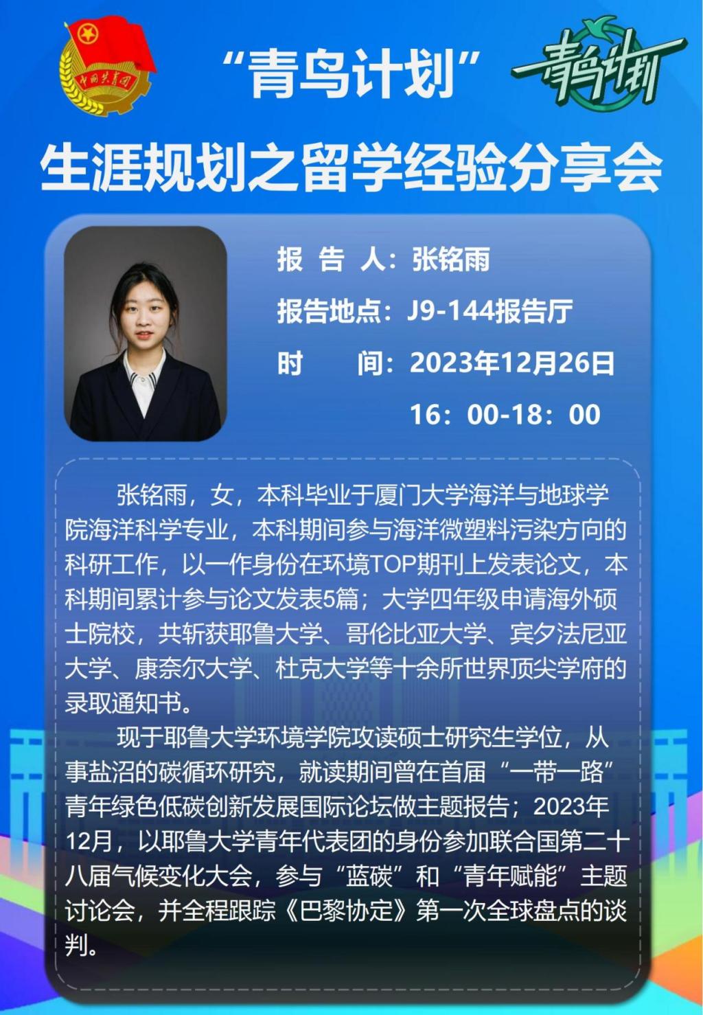 点击:为服务学生学业发展、拓展国际视野、更好规划学习生活,12月26日,即时比分球探 在J9-144报告厅举办“青鸟计划-生涯规划之留学经验分享会”。本次分享会由耶鲁大学硕士研究生张铭雨主讲,即时比分球探 部分本科生参加。