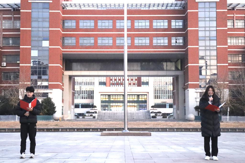 学生代表张锺雨和付钰婕在国旗下发表主题朗诵《青年》,真切阐述了新时代青年应有的担当和对青春的颂扬。从一二九运动到解放战争,中国青年始终站在时代的前沿,为民族独立、人民解放和国家富强接续奋斗。“愿吾亲爱之青年,相遇青春死于青春。生于少年,死于少年也。”更激励着一代又一代的中国青年继承先辈遗志,永葆奋斗热情,永远纯真善良。最后,全体师生庄严宣誓,反复响亮的“请党放心,强国有我”充分展现了青年学子以青春之我助力中华复兴的坚定决心。