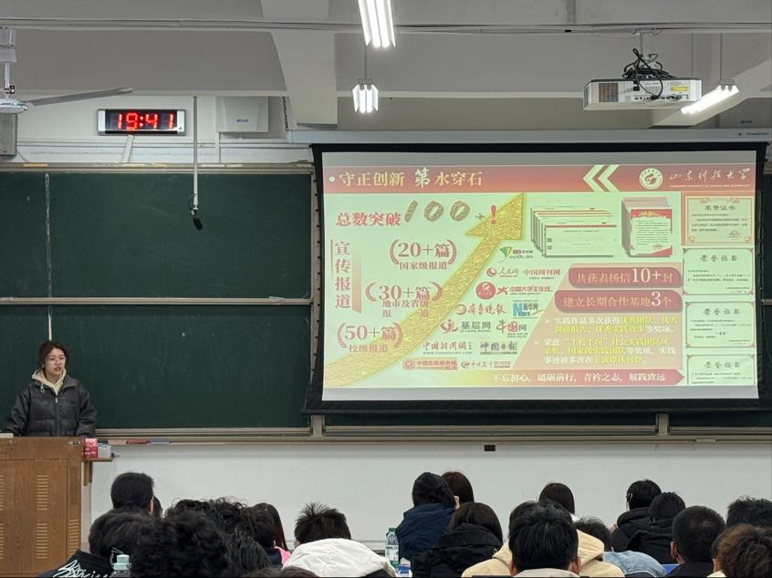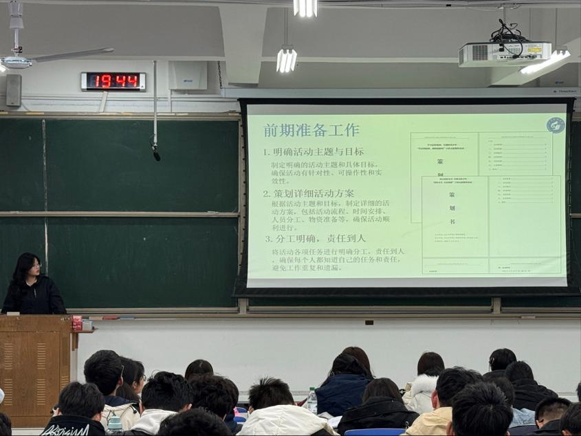 李翊尘通过《雷锋精神的时代回响》主题短片,结合当代青年学生的使命与担当,生动讲述了雷锋同志的生平事迹,深刻诠释了雷锋精神内涵。她鼓励同学们要秉持“奉献、友爱、互助、进步”的志愿者精神,投身到社会实践、志愿服务的活动中去,走出校门、走进社会,用双脚去丈量、用双眼去看见、用双耳去倾听,把论文写在祖国大地上。肖思豪以班级实践为例,系统讲解了从需求调研到活动实施的全流程,重点强调了"精准服务"对提升志愿服务效能的重要作用。崔书华和衣政翰分别结合团支部社会实践工作实际,分享了志愿服务中的沟通技巧、活动策划及团队协作等经验。