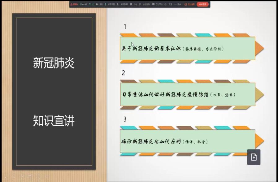 宣讲队通过钉钉直播、观看抗疫视频的方式,为当地某学校四年级一班同学进行了线上新冠疫情防控知识讲解,宣讲围绕关于新冠肺炎的基本认识、日常生活如何做好疫情防控和确诊新冠肺炎后如何应对三个主要方面展开,会议强调上学外出要做好个人防护,坚持佩戴口罩,勤洗手讲卫生,健康饮食,做好心理调适,并且要适度锻炼,增强抵抗力。