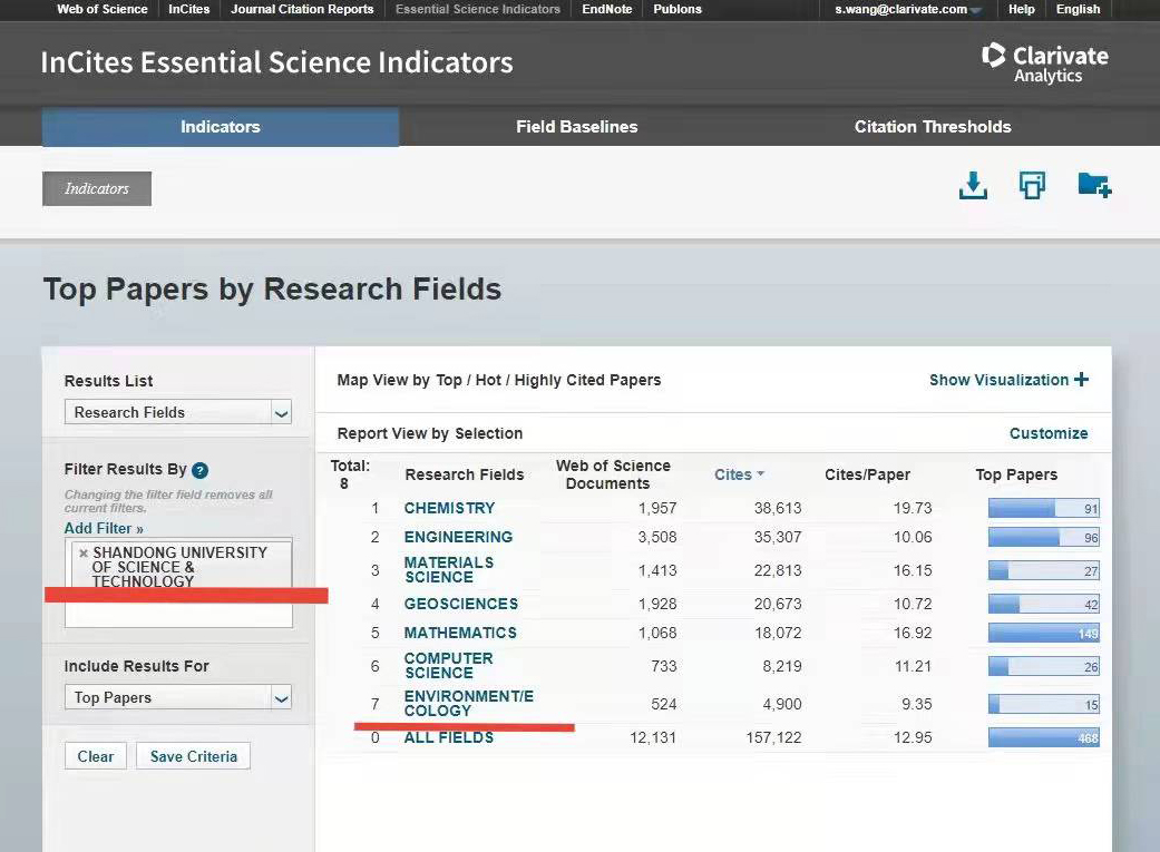 点击:3月10日,科睿唯安公布了ESI(Essential Science Indicators,基本科学指标)从2011年1月1日到2021年12月31日的统计数据。根据ESI的最新更新结果显示,山东科技大学环境/生态学科(Environment/Ecology)正式进入ESI全球排名前1%。ESI每2个月公布一次,均为上一次数据的基础上增加2个月的数据,但是每年5月份会去除掉最旧一年的数据。截止2021年12月31日,我校环境/生态学科总计发表论文524篇,总引用次数为4900,篇均引用9.35次。