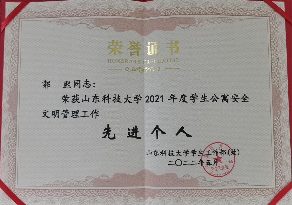 点击:5月24日,山东科技大学2021年度学生公寓工作表彰大会暨2022年学生公寓安全文明教育月活动启动仪式隆重召开。即时比分球探 荣获山东科技大学学生公寓安全文明管理工作先进单位和学生公寓文化建设工作一等奖,郭熙荣获学生公寓安全文明管理工作先进个人称号,29个学生宿舍荣获“文明宿舍”称号。