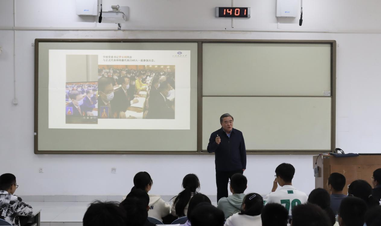 课堂上,姚庆国首先对中国共产党第二十次全国代表大会中习近平总书记所作报告的要点进行了分析,分别从“中心任务”、“本质要求”、“五个坚持”、“必由之路”四个方面进行深入浅出地讲解,指出应抓住“马克思主义是立党立国,兴党兴国的首要条件”这一核心要点,并由此呼吁同学们坚定信仰信念,坚持走中国化时代化的马克思主义行。关于“两个为什么”及“两个行”问题,姚庆国分别从“拾零”、中华民族历史以及建党百年历史等多个方面进行剖析,强调应根据马克思主义的实践性、人民性以及先进性,探索人类社会的发展规律,从而更好的完成中国特色社会主义建设。他表示,从1840年鸦片战争到1949年新中国成立,从救国兴国到富国强国,马克思主义在其中起到了深远的影响,高扬马克思主义中国化旗帜,我们必须深刻理解“两个结合”,深刻把握“两个行”。最后,结合国家发展情况及学习实际,姚庆国勉励大家要高高扬起理想的风帆,自觉将个人理想与祖国命运、民族前途紧密相连,矢志不渝,倾心报国,用大写的理想书写大写的人生;他也希望大家做“理想青年”,不做“光想青年”,志在千里,更要笃行致远,一步一个脚印,用汗水浇灌梦想。