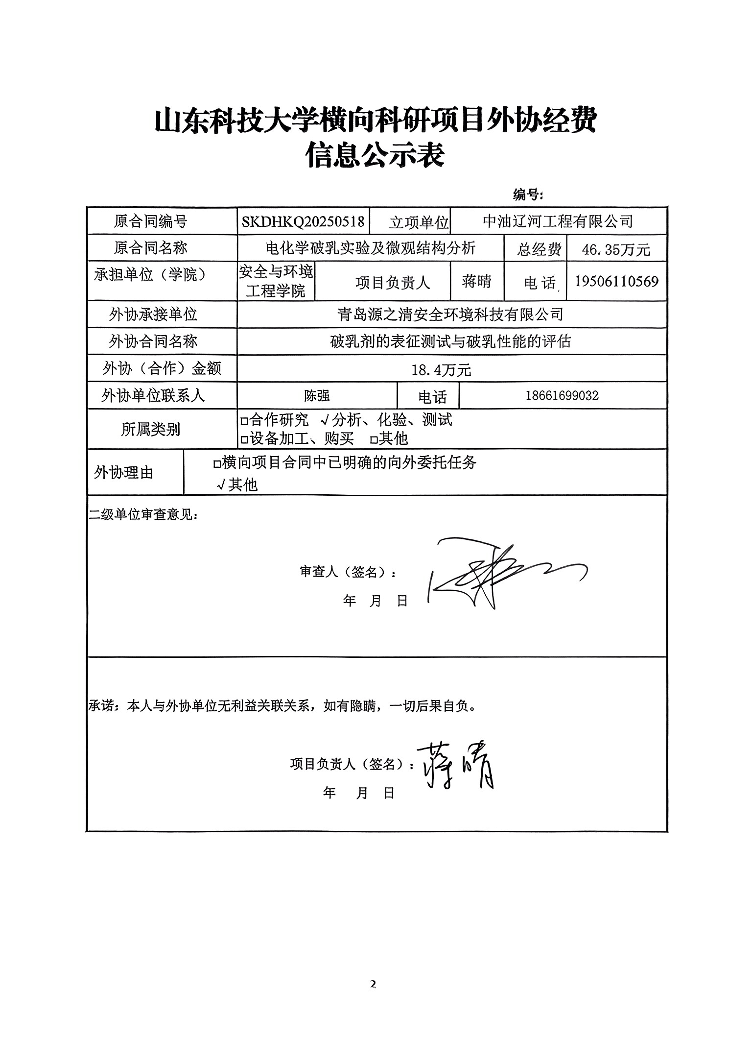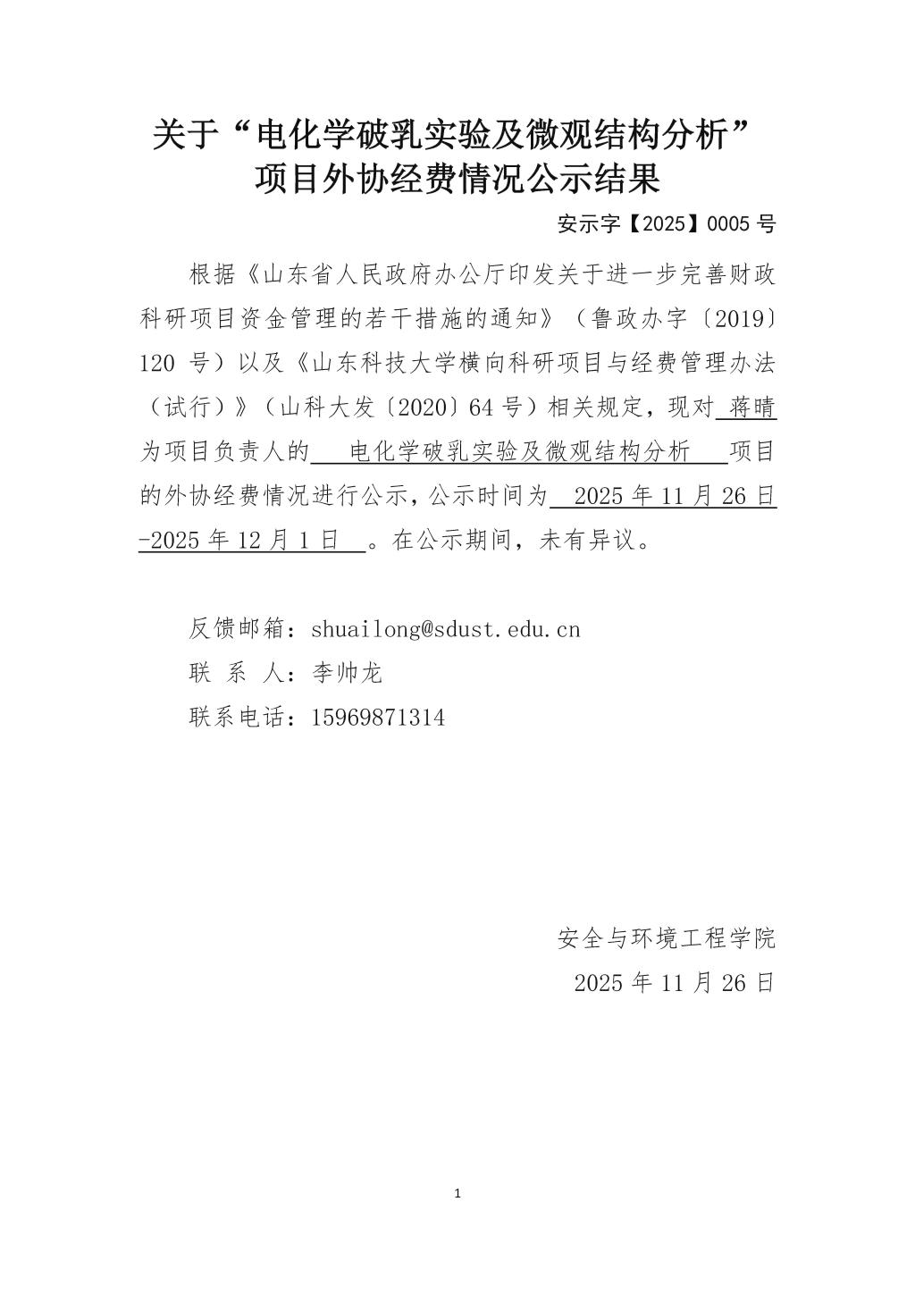 山东科技大学横向科研项目外协经费公示信息
