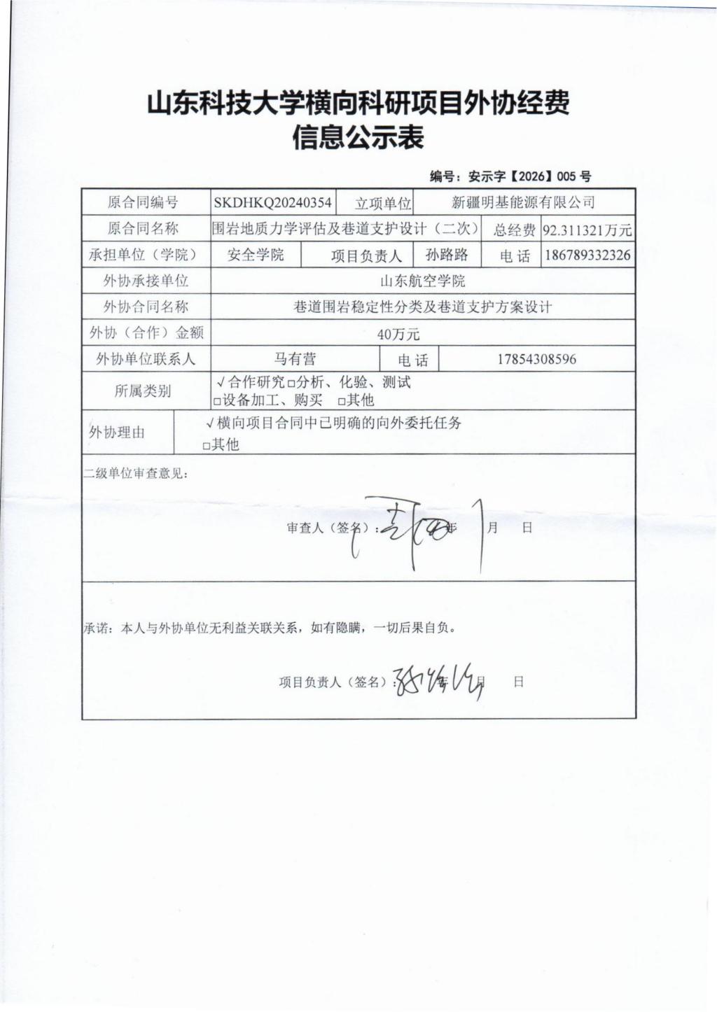 根据《山东省人民政府办公厅印发关于进一步完善财政科研项目资金管理的若干措施的通知》(鲁政办字〔2019〕120号)以及《山东科技大学横向科研项目与经费管理办法(试行)》(山科大发〔2020〕64号)相关规定,现对孙路路为项目负责人的 围岩地质力学评估及巷道支护设计(二次) 项目的外协经费情况进行公示,公示时间为 2026年03月30日至2026年04月04号(五个工作日) 。若对本项外协经费有异议,请于公示期内向即时比分球探 反映并提交书面材料。