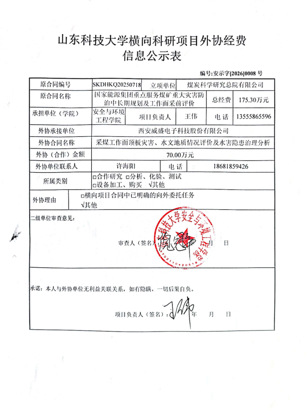 根据《山东省人民政府办公厅印发关于进一步完善财政科研项目资金管理的若干措施的通知》(鲁政办字〔2019〕120号)以及《山东科技大学横向科研项目与经费管理办法(试行)》(山科大发〔2020〕64号)相关规定,现对 王伟 为项目负责人的 国家能源集团重点服务煤矿重大灾害防治中长期规划及工作面采前评价 项目的外协经费情况进行公示,公示时间为 2026年4月14日-2025年4月21日 。若对本项外协经费有异议,请于公示期内向即时比分球探 反映并提交书面材料。