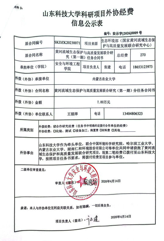 山东科技大学横向科研项目外协经费公示信息