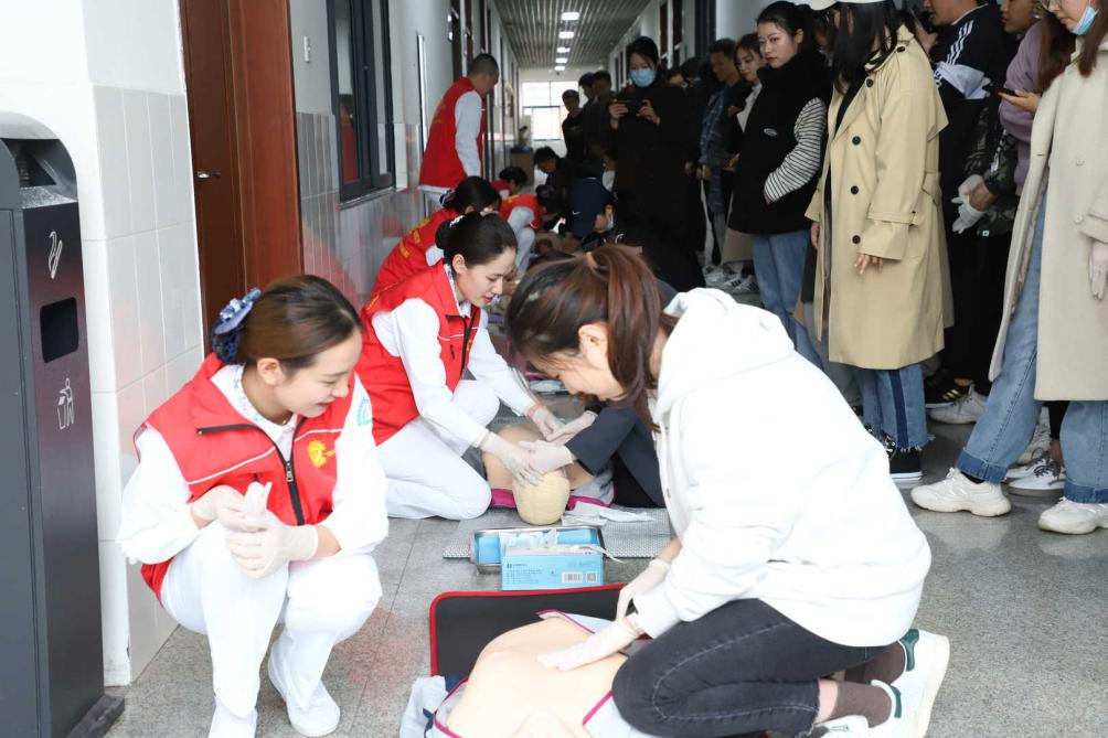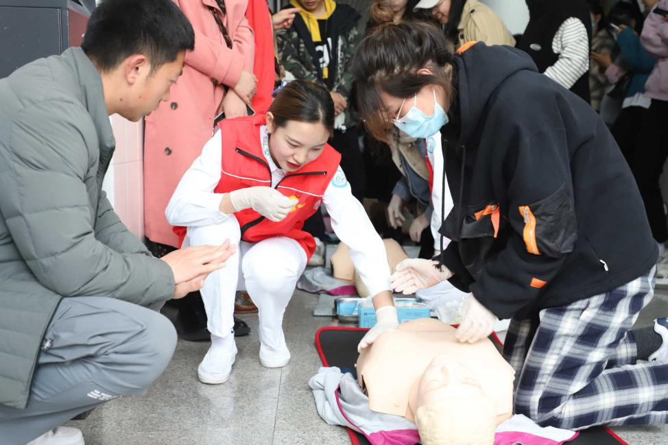 随后,为了能够让学生近距离体验“出手急救”。讲师团为现场师生奉上现场急救技术的展示,将培训活动推向了高潮。由培训师薛飞、贾双飞、邱志鑫、刘琦、何琦、孙丹丹“手把手”带领同学们进行心脏复苏的现场指导,并对同学们操作不规范的地方提出改进意见,使每位到场的同学都能规范掌握心肺复苏技能。