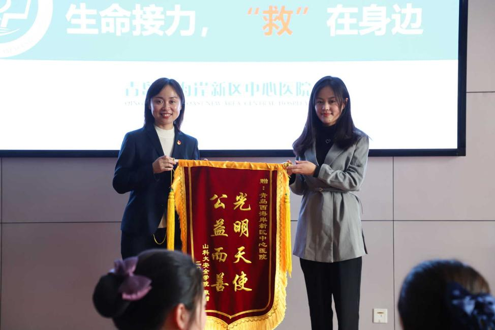 讲座最后,由姜振丽老师作为代表,对青岛西海岸新区中心医院授予“光明天使,公益而善”的锦旗。
