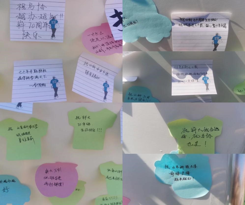 当起跑口令响起,起跑线上的第一名成员冲出起跑线,长达七十公里的征途,每一位成员拼尽全力,用速度和激情展示青春与活力,展现山科学子的风采。接力棒在他们手中一次次传递,象征着“惟真求新”的科大精神薪火相传,象征着青春向上的科大学子接力奋斗。参赛同学们用笔写下了对科大的祝福,承载着美好祝愿的展板五彩缤纷。随着最后一名队员到达终点线,“庆祝建校七十周年七十公里接力跑”活动圆满结束。本次活动,共有一百余名同学参加,中途设有补给站,为参与活动的选手提供药品、补给品以及饮品。
