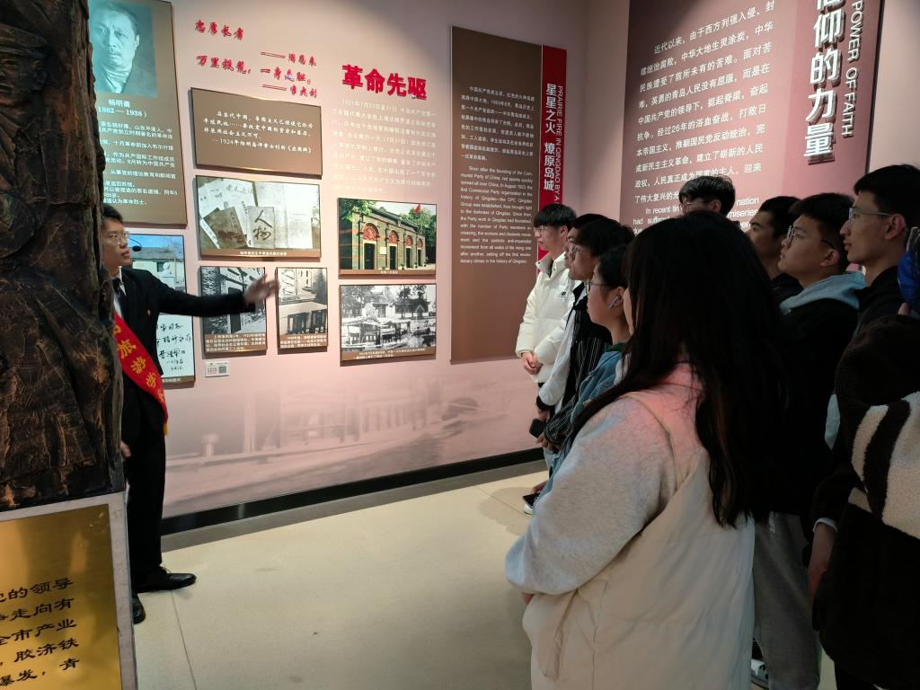 上午九点,怀着崇敬的心情,同学们顺利抵达革命烈士纪念馆。来到纪念馆内,革命先烈英勇作战的画面,为大家揭开了那段波澜壮阔的历史,将生于和平年代的同学们带回到那段战火纷飞的岁月。展厅通过仿真场景、烈士遗物、文字资料、照片画像等,向大家全面展示抗日战争、解放战争以及社会主义建设时期,在青岛这片土地上战斗过的革命先烈的先进事迹。一张张黑白照片、一件件烈士文物、一段段英雄故事,都是英烈们“抛头颅、洒热血”的见证,同学们纷纷被先烈们大无畏的精神所震撼。经过认真参观学习,班长唐福梁感悟颇深:“怀着对革命烈士的崇高敬意,我们来到青岛革命烈士纪念。一篇篇为国为民的革命故事、一幅幅记录峥嵘岁月的图片,使我们每一位同学深受触动。作为青年学生,我们要在学史感悟之中,激发担当力量,以实际行动为党和国家做贡献,更要倍加珍惜革命先烈用生命和鲜血换来的美好生活,将缅怀之情化为磅礴伟力,奋力学习、积极进取,不负青春、不负时代!”