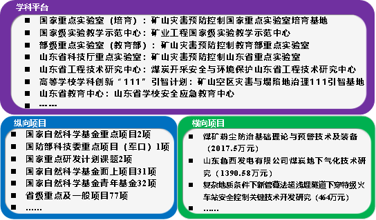 安全工程专业与依托学科建有国家级、省部级教学科研平台多个,包括国家重点实验室培育基地、国家级实验教学示范中心、教育部虚拟教研室、国家“111”引智基地、教育部重点实验室、山东省重点实验室、山东省协同创新中心、山东省工程技术研究中心等;依托雄厚的科研平台,五年来,安全工程专业教师主持国家重点研发计划等国家级项目68项、省部级项目77项,横向课题200余项,科研经费达3.6亿元;获国家科技进步二等奖1项、省部级政府奖励42项;授权发明专利275项,转化730余万元。