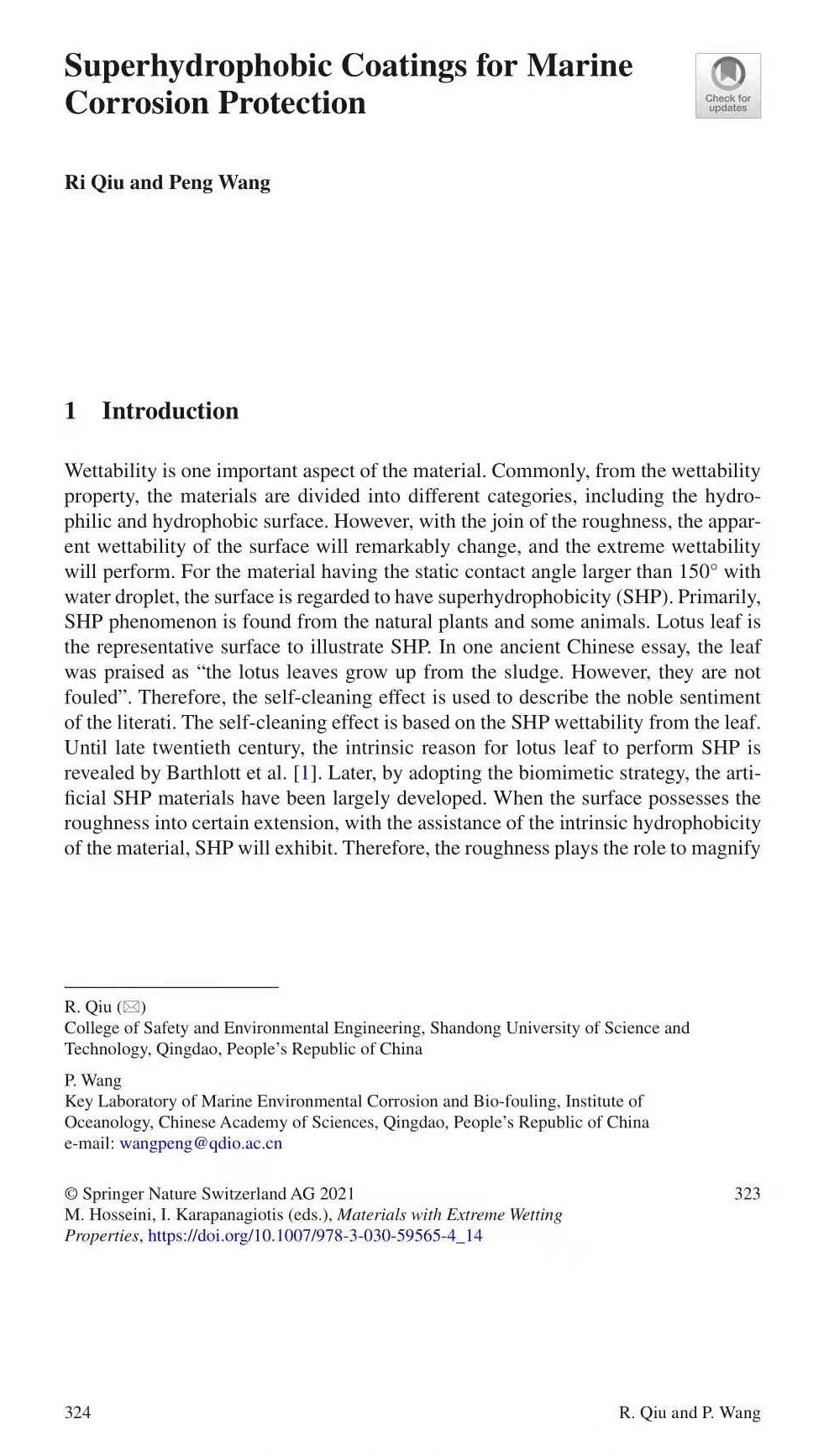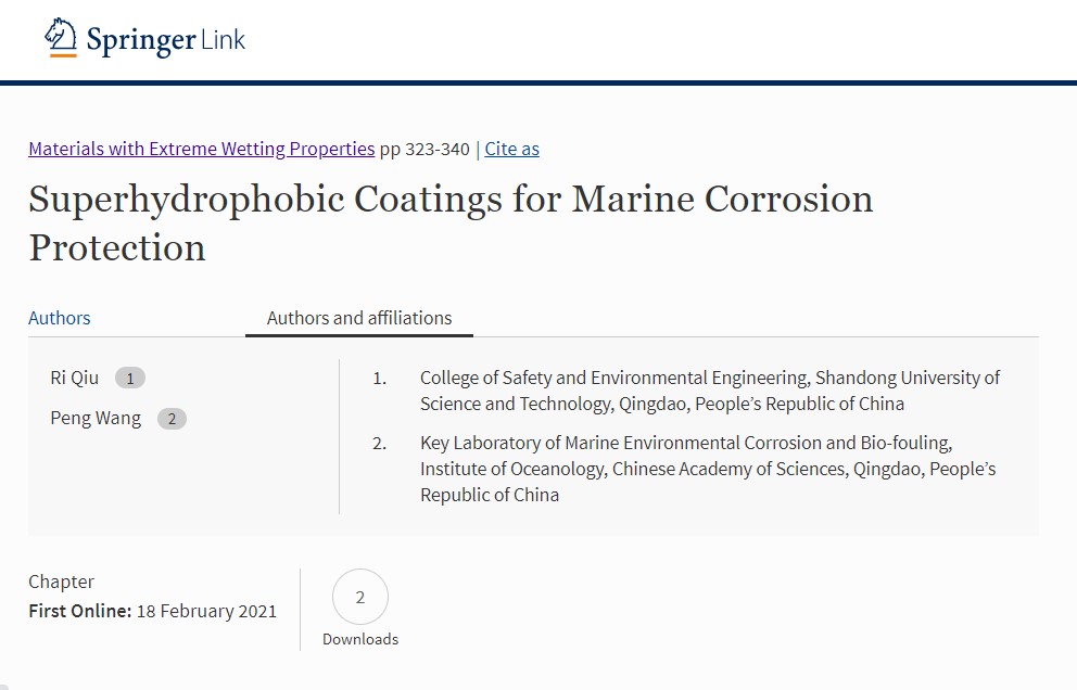 近日,球探体育即时足球比分直播 邱日副教授应邀参与撰写的关于材料极端润湿性专著Materials with Extreme Wetting Properties由世界顶级出版机构Springer Nature出版发行。该书讨论了超疏水性、超亲油性材料技术及在新兴工业中应用,为科学家和工程师进一步开发相关新材料提供了新的借鉴和参考。该书共15章,由美国得克萨斯大学大河谷分校制造与工业工程即时比分球探 Majid Hosseini博士担任编辑,所邀请作者来自美国加州大学洛杉矶分校、德国马克斯·普朗克高分子研究所等机构的学者。球探体育即时足球比分直播 邱日副教授作为第一和通讯作者撰写了该书第七章“Superhydrophobic Coatings for Marine Corrosion Protection”,综述了超疏水涂层在海洋金属腐蚀领域的应用,并对当前超疏水涂层存在的问题以及未来发展趋势做出了判断和展望。