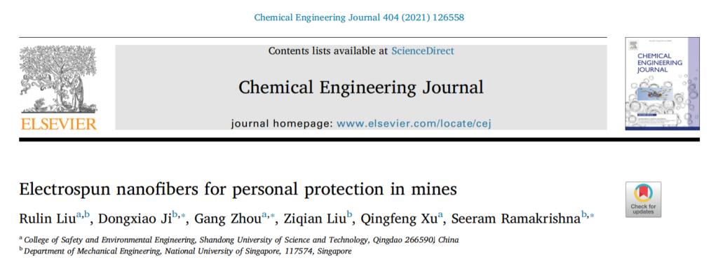 点击:近日,球探体育即时足球比分直播 周刚教授课题组与新加坡国立大学Seeram Ramakrishna教授课题组在材料、化学类顶刊《Chemical Engineering Journal》(中科院1区TOP期刊、IF=10.652)合作发表了题为“Electrospun nanofibers for personal protection in mines”的论文。我校为第一通讯单位,周刚教授为通讯作者,2019级博士柳茹林为论文第一作者。这是球探体育即时足球比分直播 教师首次与国际顶尖团队合作发表高水平学术论文。