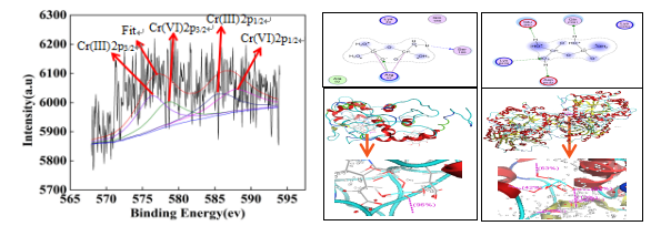 研究还发现,球等鞭金藻对Cr(VI)胁迫引起的氧化应激具有调控作用,主要表现在丙二醛含量升高,微藻酶系统产生应急调控;Cr(VI)既可以在微藻细胞表面进行吸附也可以在藻细胞内部进行累积;并通过XPS证实了Cr(VI)在细胞内部分转化为Cr(Ⅲ)而降低其毒性,分子模拟也进一步验证了实验结果。