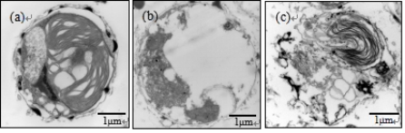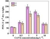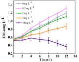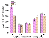 研究发现,Cr(VI)胁迫环境对球等鞭金藻生物量,叶绿素a和可溶性蛋白含量产生影响,其浓度为0.5mg/L时,可促进生长、叶绿素a和可溶性蛋白的合成增多。浓度由1.0mg/L增加至10.0mg/L时,微藻的生长受到抑制,叶绿素a和可溶性蛋白的合成相应减少。并引起微藻细胞结构的破坏。