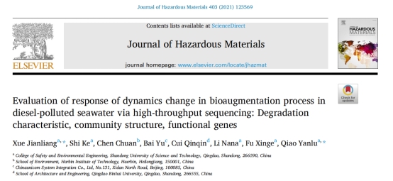 点击:近日,球探体育即时足球比分直播 薛建良副教授课题组在环境领域TOP期刊《Journal of Hazardous Materials》(IF=9.038)上发表了题为“Evaluation of response of dynamics change in bioaugmentation process in diesel-polluted seawater via high-throughput sequencing: Degradation characteristic, community structure, functional genes”的论文。文章采用生物强化技术对模拟的海洋溢油事件进行修复,并对原生海洋环境,溢油过程以及生物强化修复过程的微生物群落结构进行了研究。