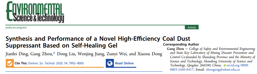 点击:2020年7月1日,球探体育即时足球比分直播 周刚教授粉尘职业健康防护课题组在环境领域国际顶级期刊《Environmental Science & Technology》(IF=7.864)上发表了题为“Synthesis and Performance of a Novel High-Efficiency Coal Dust Suppressant Based on Self-Healing Gel”的论文。周刚教授为该论文的唯一通讯作者,第一作者为2017级硕士研究生丁建飞。