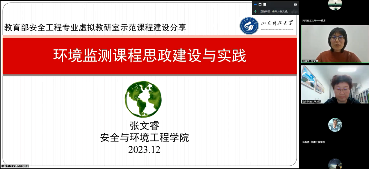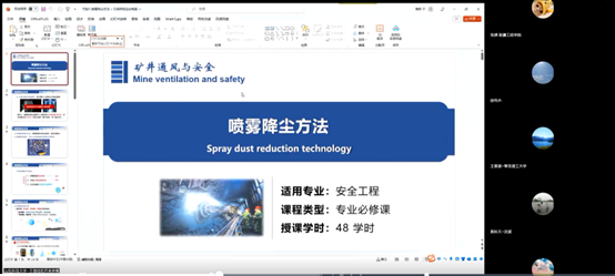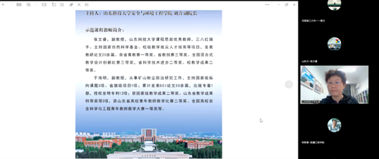 会上,山东科技大学张文睿副教授以环境监测课程思政建设与实践为题,从基本情况、课程设计、实施方案以及评价成效四个方面介绍了思政课程的建设思路与成功经验;于海明副教授结合自身青年教师讲课比赛经历,进行了矿井通风与安全示范课程的展示与讲解。本次活动吸引了来自新疆工程即时比分球探 、黑龙江科技大学以及辽宁工程技术大学等虚拟教研室12所共建单位的70余位专家、老师参与。青岛科技大学的程家骥副教授、河南理工大学的王云刚副教授、贵州大学的韦善阳副教授高度赞扬了示范课程讲授内容和沙龙活动举办形式。