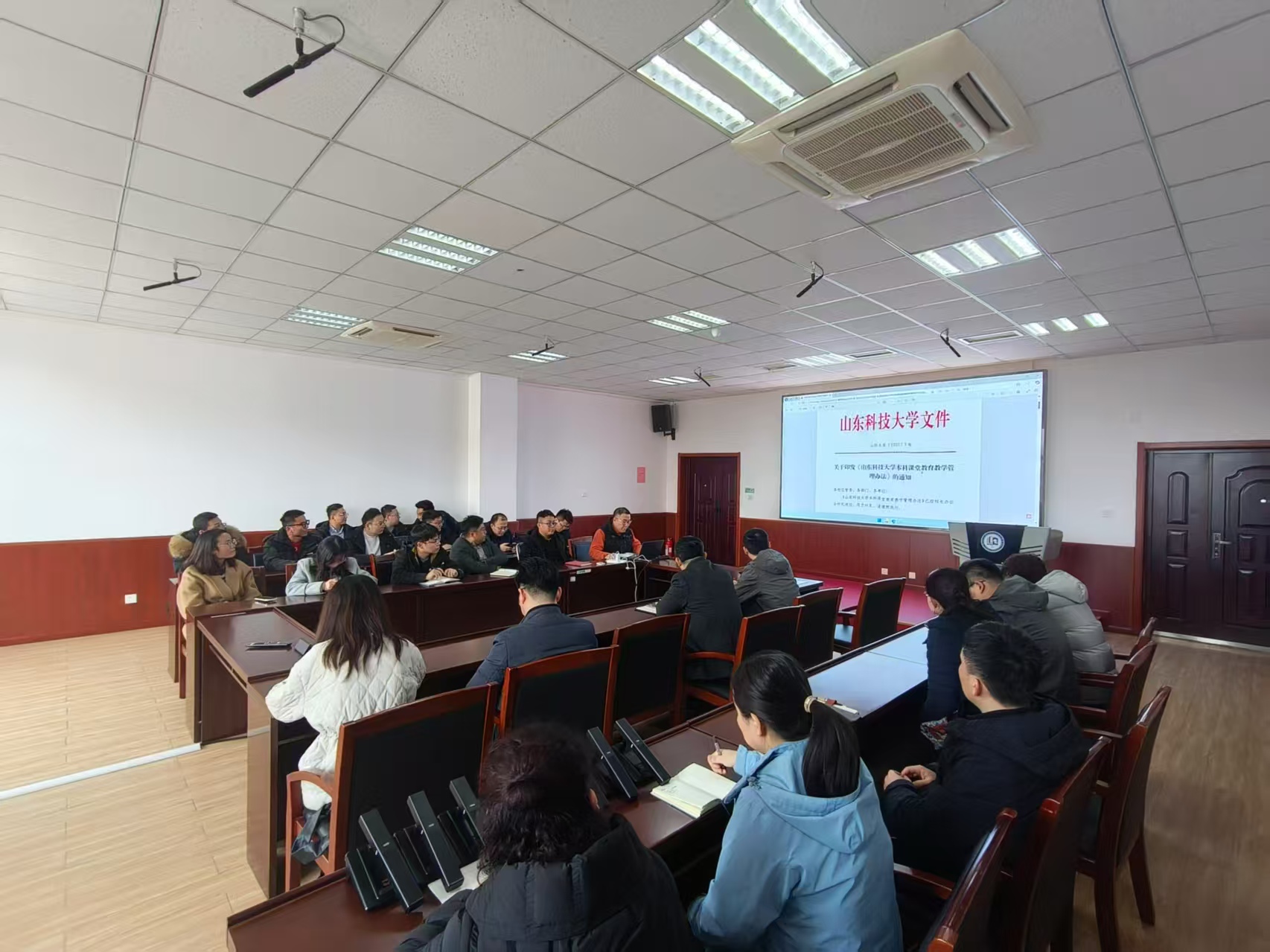会议伊始,倪冠华老师强调了此次学习的重要性,指出《山东科技大学本科课堂教育教学管理办法》是学校为了进一步规范本科课堂教学,提高教学质量而制定的重要文件,对于每一位教师的教学工作都有着明确的指导意义和规范要求。随后,杨文宇老师详细地对文件精神进行了传达和解读,从教学规范、课堂管理、教学质量评价等多个维度,深入剖析了文件中的各项规定和要求,帮助教师们全面理解文件的核心要义。