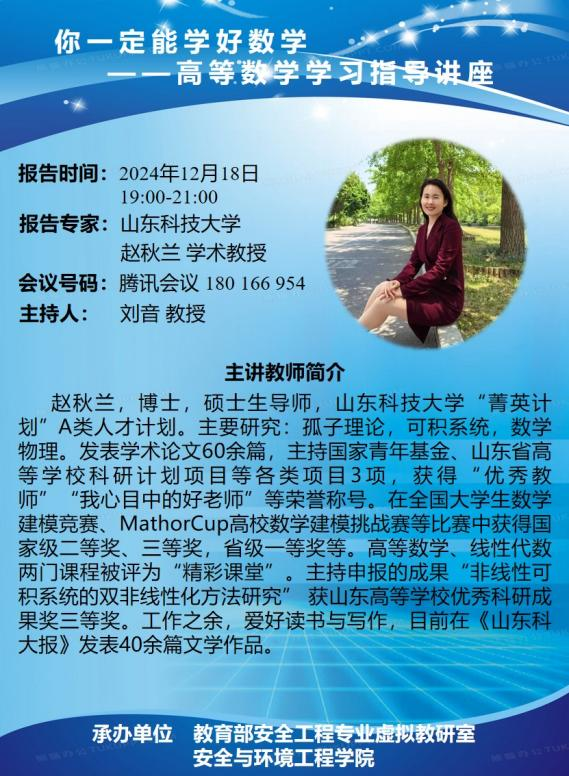 临近期末考试,为提升2024级新生高等数学学习技巧,顺利通过高等数学期末考试,2024年12月18日,即时比分球探 协同教育部安全工程虚拟教研室举办高数学习线上讲座。讲座由赵秋兰教授主讲,刘音副院长主持,旨在激发学生对高等数学的学习兴趣,提升学习能力,帮助学生在高等数学学习上取得更好的成绩。赵秋兰教授凭借丰富的教学经验和学术成就,为学生提供了宝贵的学习策略。本次讲座从“三讲”原则、“三目标”、“两条线交叉”三个...
