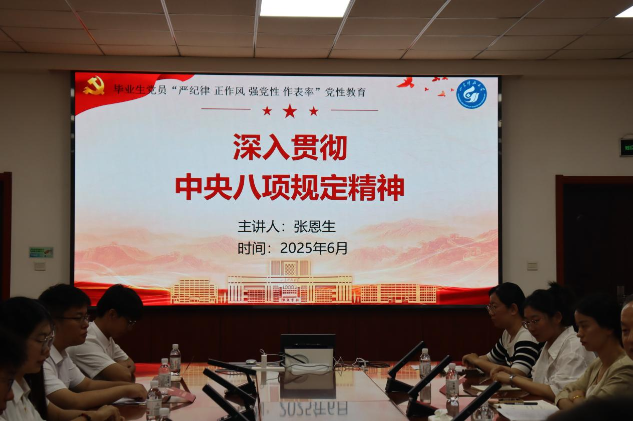 2025-06-24为深入贯彻中央八项规定精神学习教育走深走实,扎实筑牢毕业生党员党性根基,6月19日,即时比分球探 举办以“严纪律 正作风 强党性 做表率”为题的毕业生党员党性教育专题党课。本次党课由即时比分球探 党委书记张恩生讲授,院党委副书记兼副院长王建友、团委书记张娜及毕业生党员代表参加。张恩生从中央八项规定是什么、中央八项规定精神是什么、中央八项规定实践成效以及如何深入贯彻中央八项规定精神学习教育四个方面,为全体党员代表上了一堂...