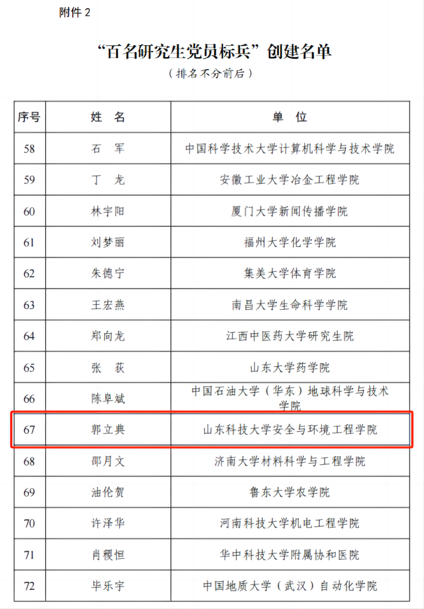 近日,教育部公布了第三批全国高校“百名研究生党员标兵”创建工作评审结果。球探体育即时足球比分直播 博士研究生郭立典入选“百名研究生党员标兵”。郭立典,男,中共党员,安全科学与工程2021级在读博士。在校期间,牢记初心使命,怀揣报国之志,攻关卡脖子技术,在粉尘防治领域取得国际领先水平,发表高水平SCI论文7篇,申请发明专利4项;获全国煤炭行业优秀共青团员、研究生党员标兵等荣誉15项;获第十七届“挑战杯”大学生课外学术科技作品竞赛...