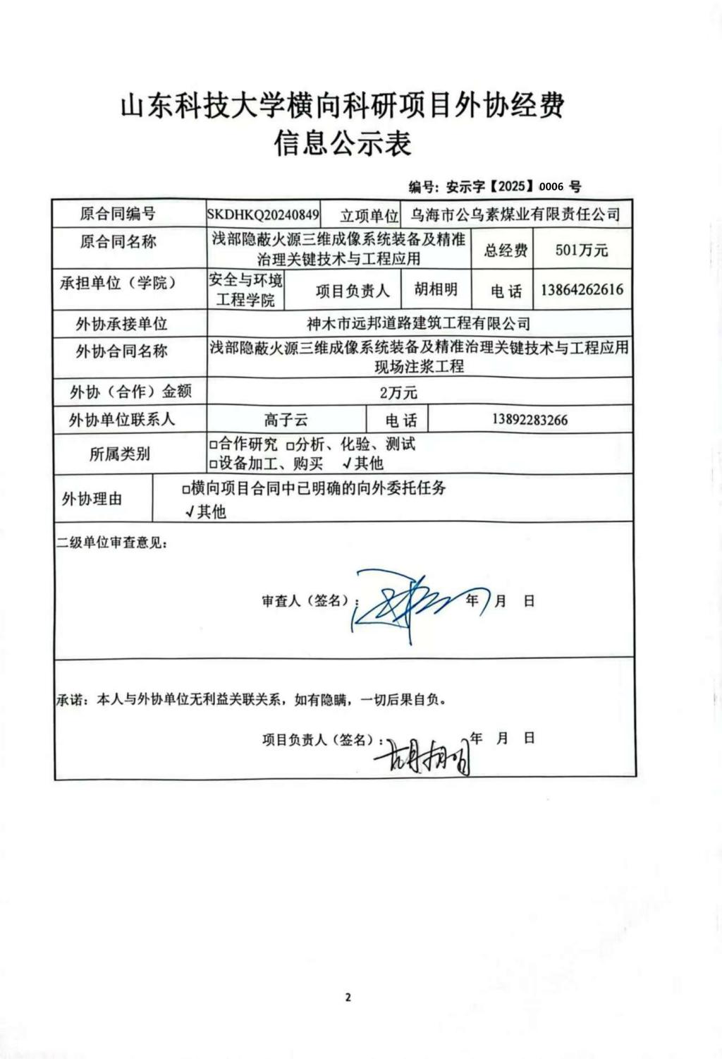 根据《山东省人民政府办公厅印发关于进一步完善财政科研项目资金管理的若干措施的通知》(鲁政办字〔2019〕120号)以及《山东科技大学横向科研项目与经费管理办法(试行)》(山科大发〔2020〕64号)相关规定,现对 胡相明 为项目负责人的 浅部隐蔽火源三维成像系统装备及精准治理关键技术与工程应用 项目的外协经费情况进行公示,公示时间为 2025年11月28日-2025年12月2日 。若对本项外协经费有异议,请于公示期内向即时比分球探 反映并提交书面材料。